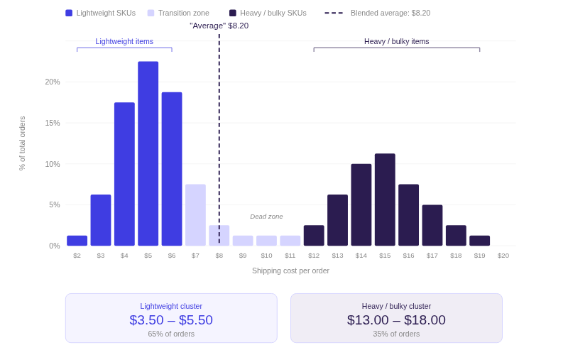 The $8.20 average mathematically exists, but no individual order costs $8.20 to ship. It's a fiction that allows the heavy-item losses to hide behind the lightweight-item gains.