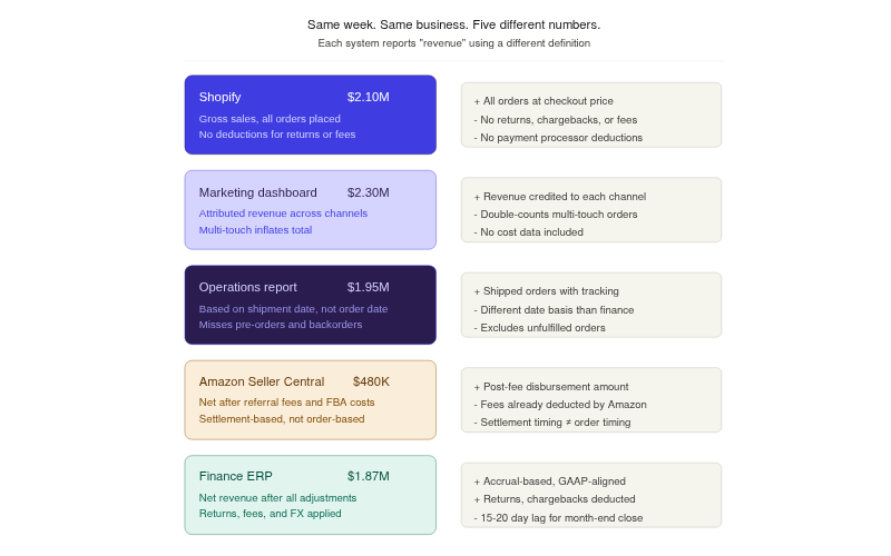 Consider a DTC skincare brand doing $55M across Shopify, Amazon, and TikTok. Marketing reports $2.1M in weekly revenue because they pull from Shopify's gross sales. Finance reports $1.87M because they account for returns, chargebacks, and payment processing fees. Operations reports $1.95M because they use a different date range based on shipment date rather than order date. Three teams, three spreadsheets, three versions of revenue. The Monday leadership meeting turns into a 30-minute reconciliation exercise instead of a strategy discussion. Reconciling financial data across systems becomes the actual job, not a step toward the job.