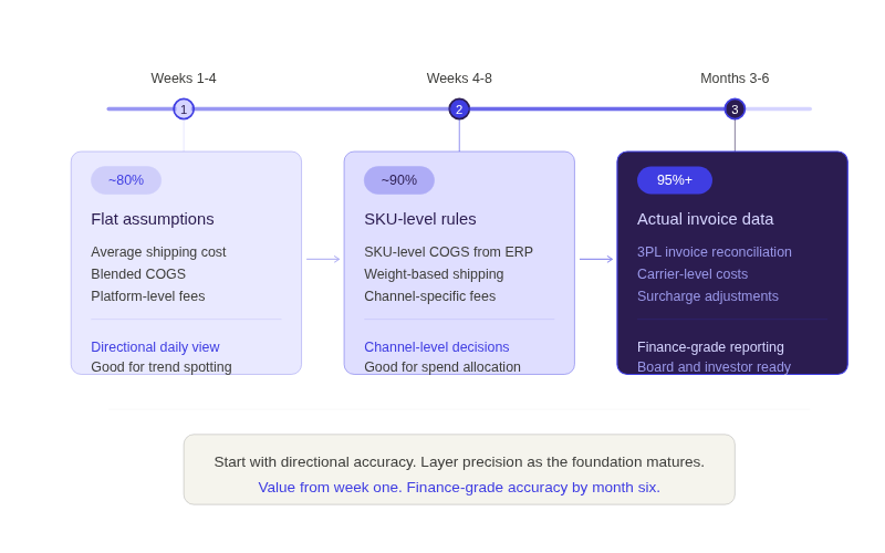 The accuracy does not have to be perfect from the start. A phased milestone approach works well: flat assumptions in phase one (average shipping cost, blended COGS) get you to roughly 80% accuracy within weeks, good enough for a directional daily view. SKU-level COGS and weight-based shipping rules in phase two push accuracy to about 90%. Actual 3PL invoice data and carrier-level costs in phase three reach 95%+ accuracy over a few months. The key is getting value from day one rather than waiting six months for perfection.