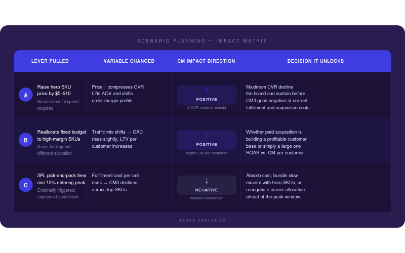 Scenario C asks: if pick-and-pack fees increase by 12% entering peak season, what is the CM3 impact across the top 20 SKUs, and which response protects margin most effectively: absorbing the cost, bundling slower-moving SKUs with hero products to offset per-unit fulfillment, or renegotiating carrier allocation ahead of the peak window? Brands that have modeled this before the cost hits make the decision in hours. Brands that have not spend weeks reconciling impact on data that should have been ready before the commitment was made.